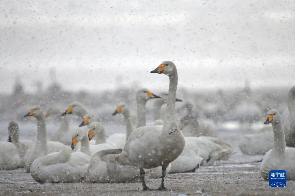 11月30日,在山東榮成天鵝湖,成群大天鵝在降雪的湖畔休憩。