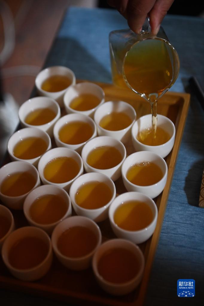 11月30日,大唐貢茶院的紫筍茶制作技藝傳承人林瑞煬把煮好的紫筍茶湯倒入茶具中。