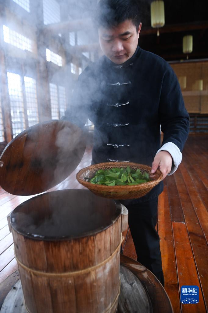 11月30日,大唐貢茶院的紫筍茶制作技藝傳承人林瑞煬采用傳統方法制茶。這是在蒸鮮葉。