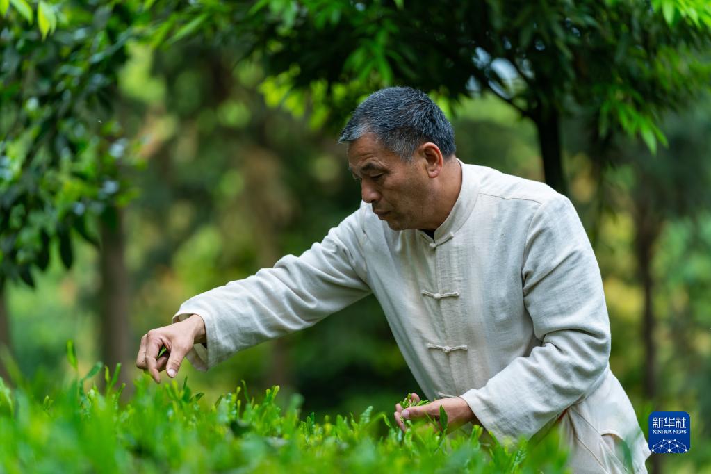 在四川省雅安市名山區的張氏祖屋附近,張躍華在采摘鮮葉(2022年3月31日攝)。蒙山茶產(chǎn)于四川省雅安市名山區境內的蒙頂山,是綠茶的一種。張躍華,生于1959年,是國家級非物質(zhì)文化遺產(chǎn)代表性項目——綠茶制作技藝(蒙山茶傳統制作技藝)的代表性傳承人。張躍華自幼隨父親學(xué)習蒙山茶傳統制作技藝,是“張氏甘露”第五代傳人,他每年都要招收年輕徒弟,希望蒙山茶傳統制作技藝能世世代代傳承下去。