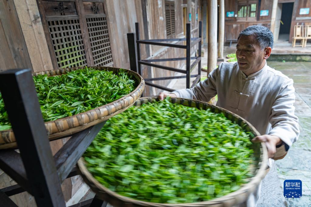 在四川省雅安市名山區的張氏祖屋,張躍華用傳統方式攤晾新采摘的鮮葉(2022年3月31日攝)。蒙山茶產(chǎn)于四川省雅安市名山區境內的蒙頂山,是綠茶的一種。張躍華,生于1959年,是國家級非物質(zhì)文化遺產(chǎn)代表性項目——綠茶制作技藝(蒙山茶傳統制作技藝)的代表性傳承人。張躍華自幼隨父親學(xué)習蒙山茶傳統制作技藝,是“張氏甘露”第五代傳人,他每年都要招收年輕徒弟,希望蒙山茶傳統制作技藝能世世代代傳承下去。
