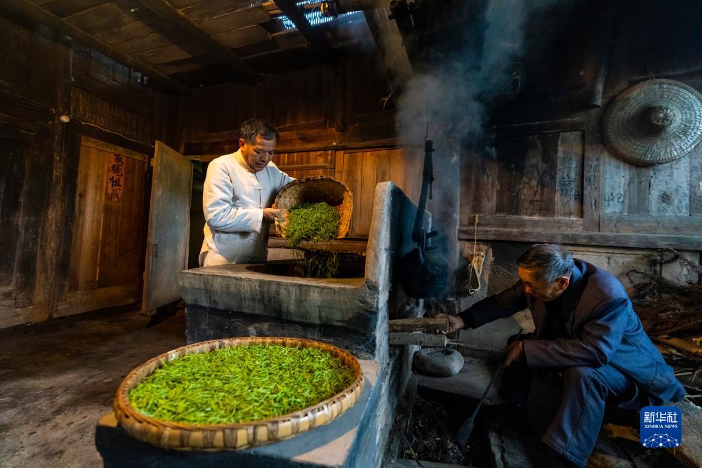 在四川省雅安市名山區的張氏祖屋,張躍華(左)用傳統的“紅鍋殺青”方式對攤晾后的鮮葉進(jìn)行殺青(2022年3月31日攝)。蒙山茶產(chǎn)于四川省雅安市名山區境內的蒙頂山,是綠茶的一種。張躍華,生于1959年,是國家級非物質(zhì)文化遺產(chǎn)代表性項目——綠茶制作技藝(蒙山茶傳統制作技藝)的代表性傳承人。張躍華自幼隨父親學(xué)習蒙山茶傳統制作技藝,是“張氏甘露”第五代傳人,他每年都要招收年輕徒弟,希望蒙山茶傳統制作技藝能世世代代傳承下去。