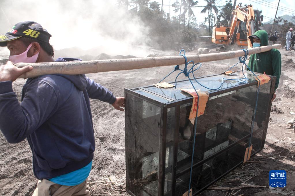 12月6日,在印度尼西亞?wèn)|爪哇省盧馬姜縣松伯武盧村,人們攜帶物品撤離受火山噴發(fā)影響的區域。