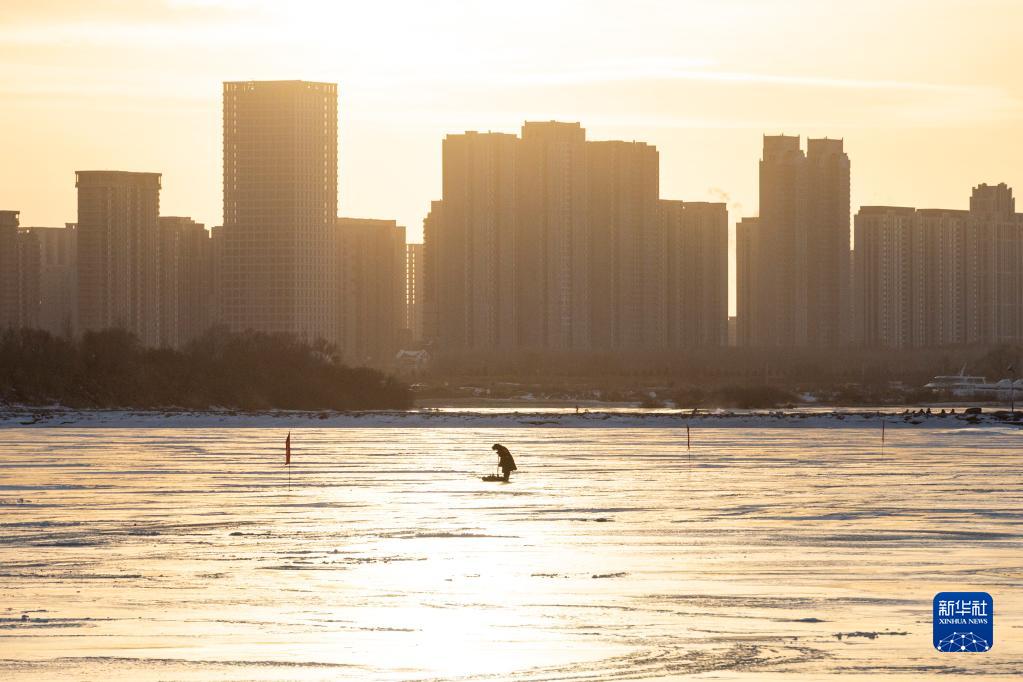 12月6日,工人在松花江哈爾濱段封凍的江面上采冰。