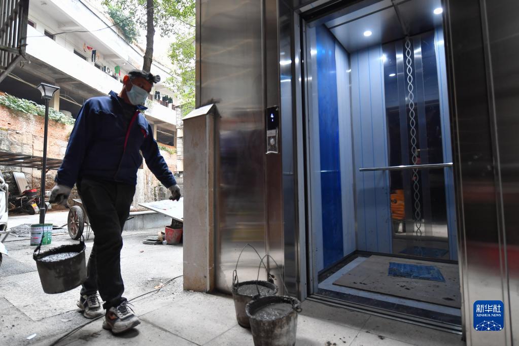 12月7日,在長(cháng)沙市天心區裕南街街道長(cháng)坡社區木材廠(chǎng)宿舍,工人準備乘坐電梯上樓施工。