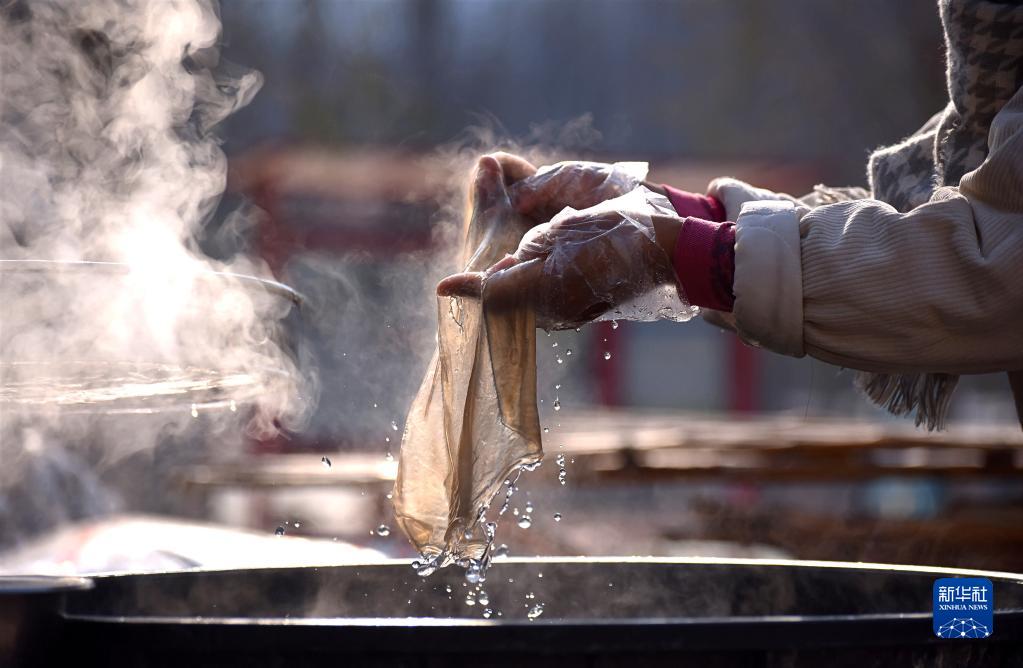 12月6日,山東省淄博市沂源縣石橋鎮石樓村的村民在加工粉皮。