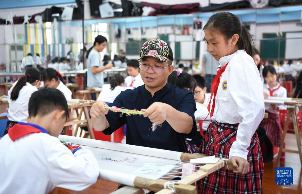 在廣州市荔灣區康有為紀念小學(xué)的廣繡課堂,王新元在指導學(xué)生(10月12日攝)。