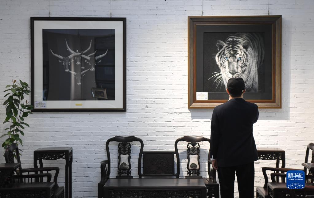 在廣州市荔灣區的工作室,王新元端詳廣繡作品(12月6日攝)。