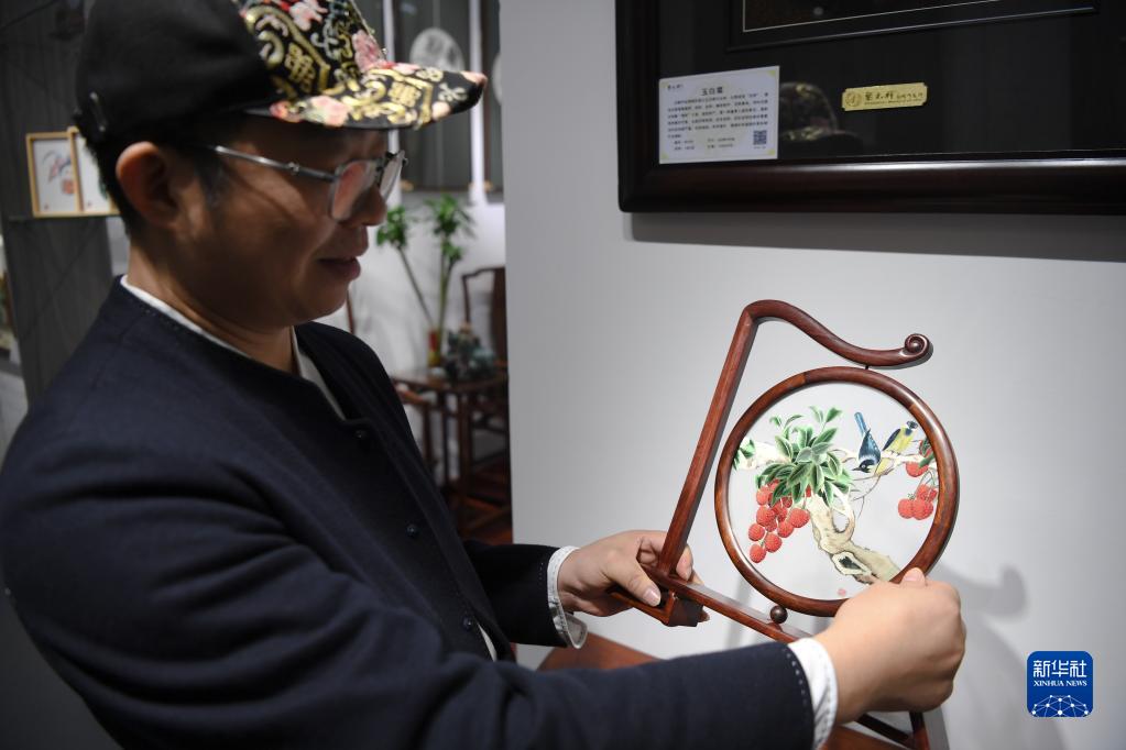 在廣州市荔灣區的工作室,王新元展示傳統廣繡作品(12月6日攝)。
