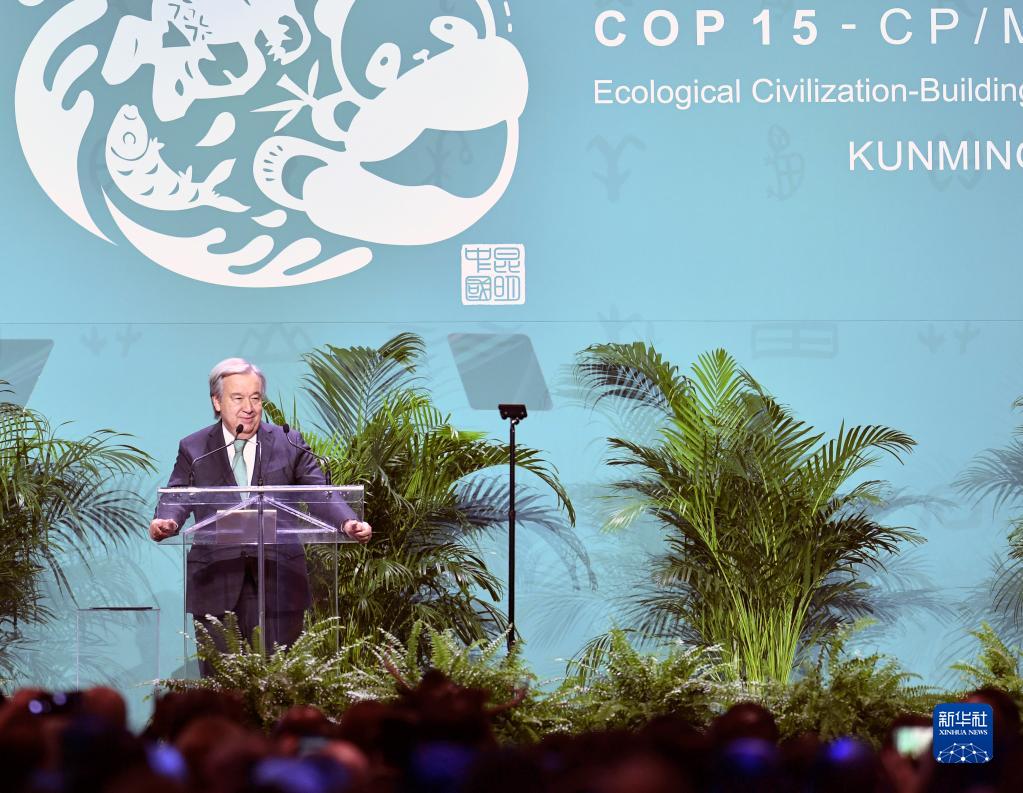 12月6日,在加拿大蒙特利爾,聯(lián)合國秘書(shū)長(cháng)古特雷斯在《生物多樣性公約》第十五次締約方大會(huì )(COP15)第二階段會(huì )議開(kāi)幕前夕的歡迎儀式上講話(huà)。