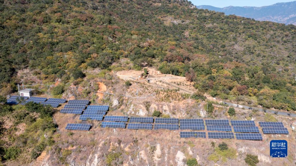 這是11月28日在攀枝花蘇鐵國家級自然保護區內拍攝的光伏板(無(wú)人機照片)。保護區通過(guò)光伏板儲能抽水,用于植物灌溉。