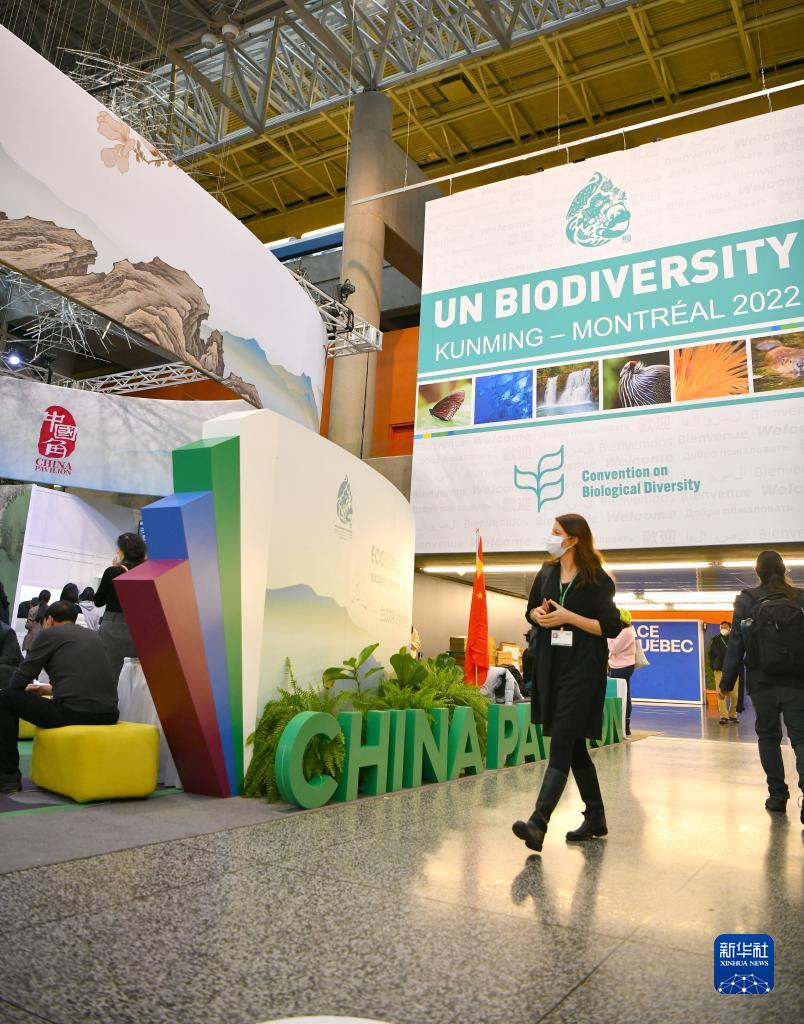 12月7日,在加拿大蒙特利爾,一名與會(huì )者從《生物多樣性公約》第十五次締約方大會(huì )(COP15)第二階段會(huì )議中國角前經(jīng)過(guò)。