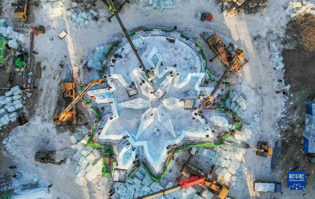 12月8日拍攝的哈爾濱冰雪大世界園區冰建項目施工現場(chǎng)(無(wú)人機照片)。