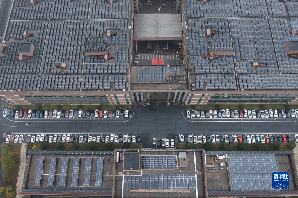 12月9日拍攝的杭州市臨安區金馬工業(yè)園區內的一家“無(wú)廢工廠(chǎng)”,屋頂上安裝了光伏發(fā)電設備(無(wú)人機照片)。新華社記者 徐昱 攝