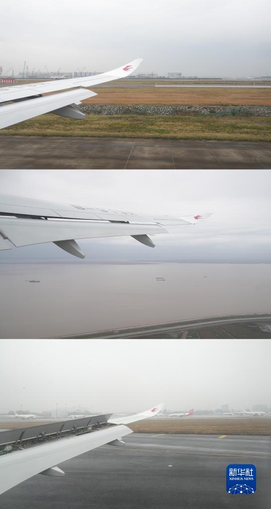 拼版照片:12月9日,國產(chǎn)大飛機C919在上海浦東國際機場(chǎng)的跑道上滑行,準備起飛(上圖);12月9日,國產(chǎn)大飛機C919在上海浦東國際機場(chǎng)起飛升空(中圖);12月9日,國產(chǎn)大飛機C919在上海虹橋機場(chǎng)落地(下圖)。
