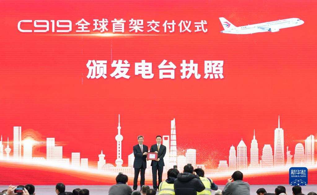 12月9日,在交付儀式現場(chǎng),民航華東地區管理局向東航頒發(fā)電臺執照。