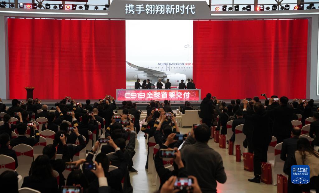 12月9日拍攝的國產(chǎn)大飛機C919交付全球首家用戶(hù)東航的儀式現場(chǎng)。