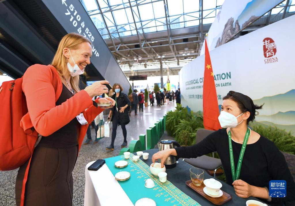 12月7日,一名與會(huì )者在加拿大蒙特利爾《生物多樣性公約》第十五次締約方大會(huì )(COP15)第二階段會(huì )議中國角品嘗中國茶。