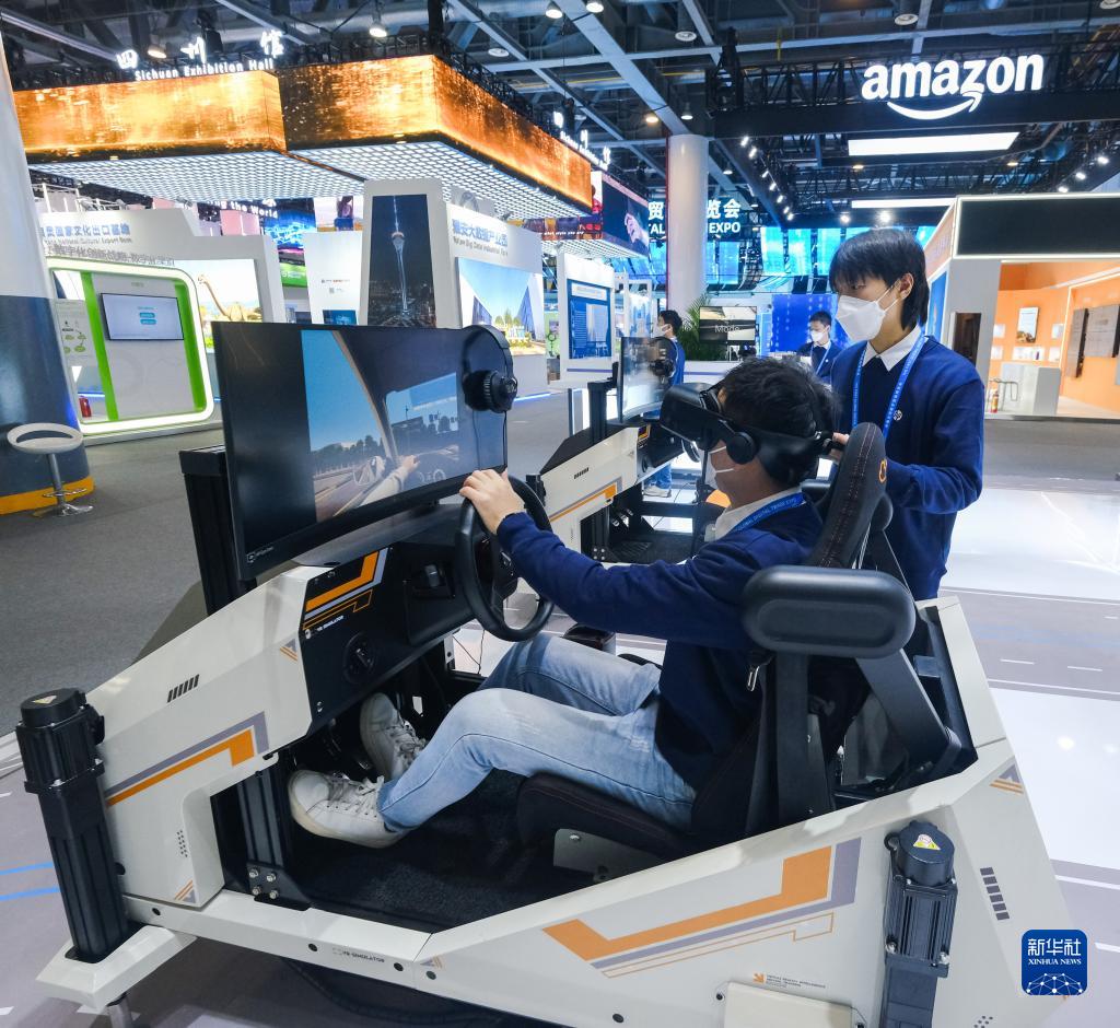 12月11日,在首屆全球數字貿易博覽會(huì )現場(chǎng),工作人員在展示虛擬駕駛系統。