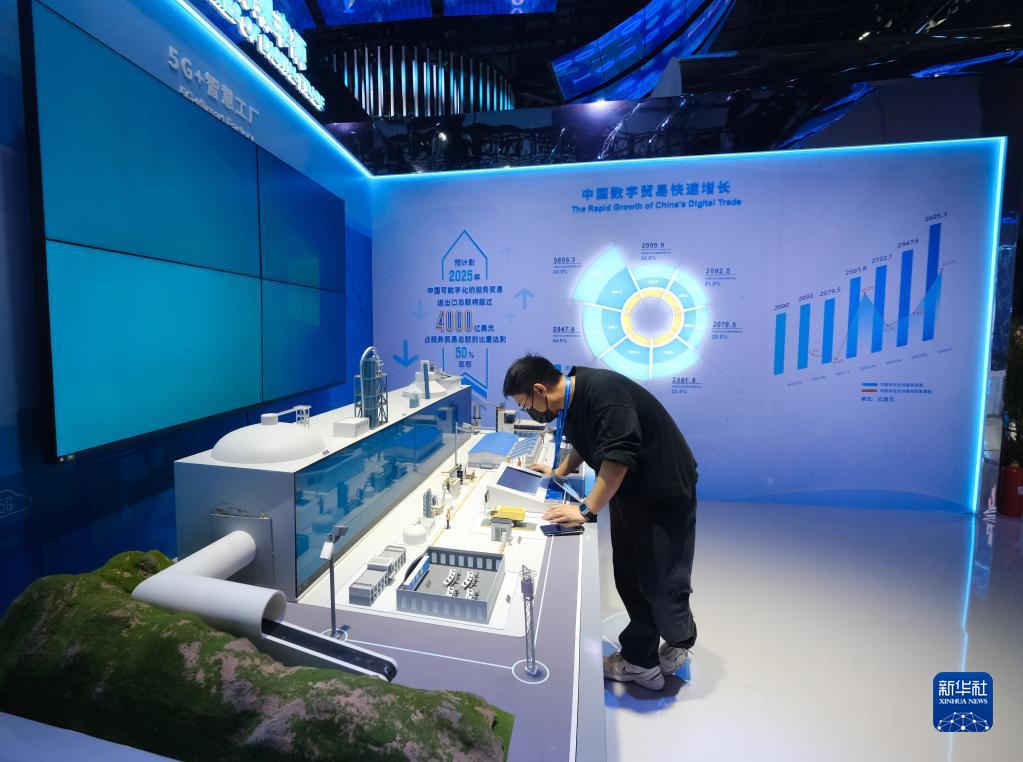 12月11日,在首屆全球數字貿易博覽會(huì )現場(chǎng),工作人員在調試5G+智慧工廠(chǎng)模型。