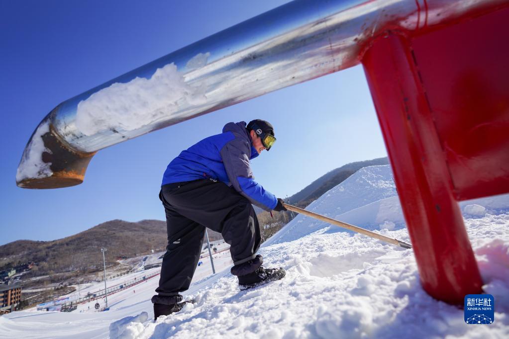 V-PARK地形公園團隊成員在道具旁平整雪道(12月9日攝)。