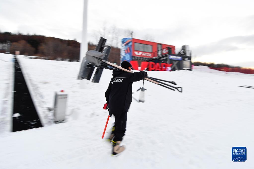 一名V-PARK地形公園團隊成員攜帶工具前往作業(yè)地點(diǎn)(12月9日攝)。