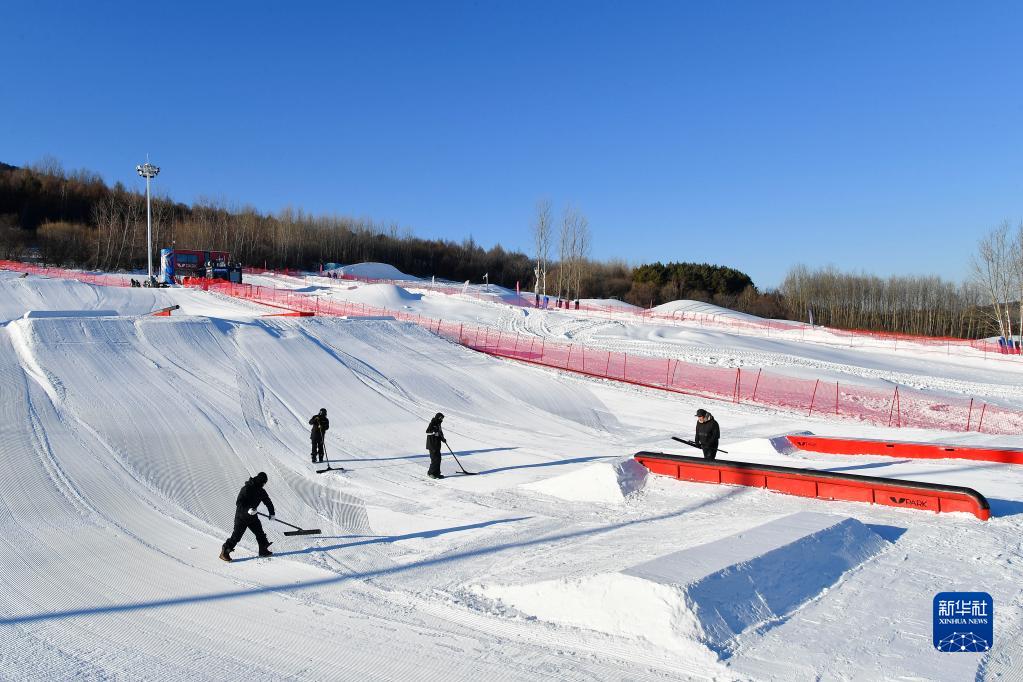 V-PARK地形公園團隊成員在平整雪道(12月10日攝)。