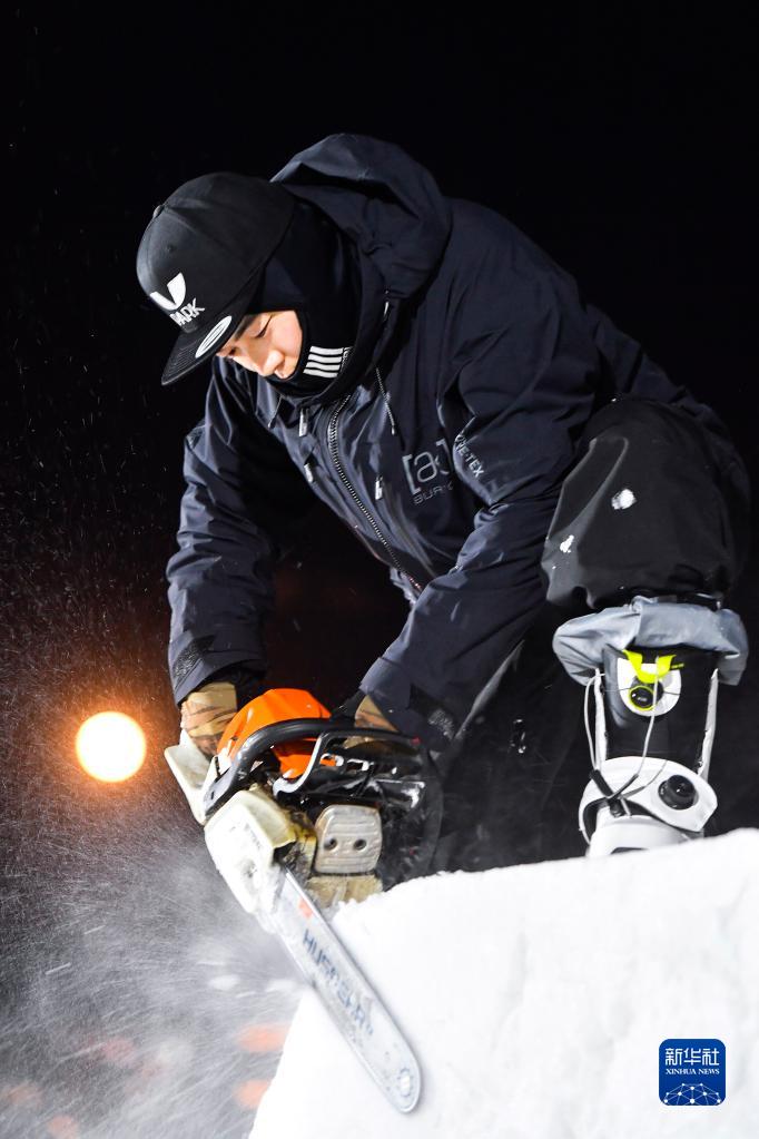 V-PARK地形公園主理人魏維使用電鋸進(jìn)行跳臺塑形工作(12月9日攝)。