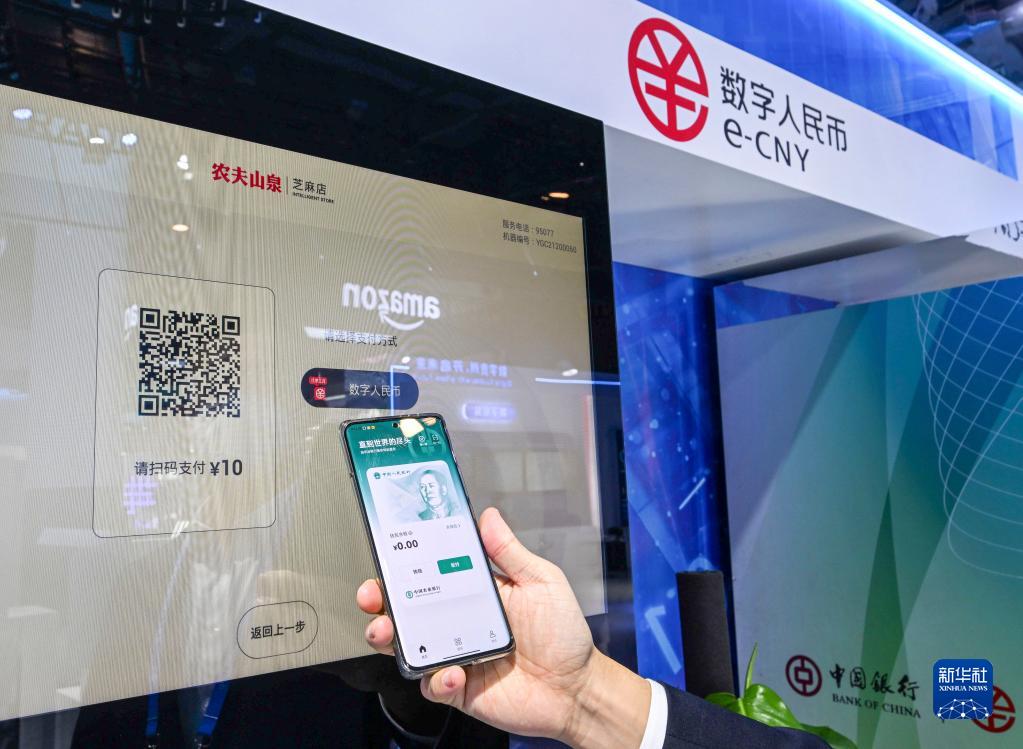 12月12日,工作人員在首屆全球數字貿易博覽會(huì )上展示數字人民幣的應用場(chǎng)景。