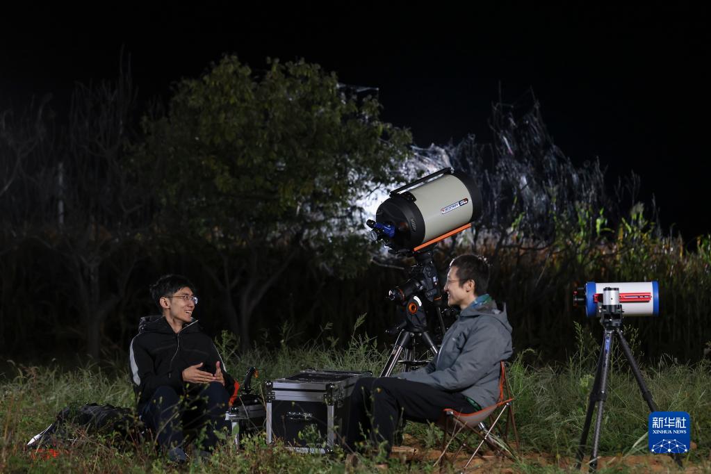 9月20日晚,劉博洋(左)和好友王卓驍在中國空間站過(guò)境前進(jìn)行科普直播活動(dòng)。