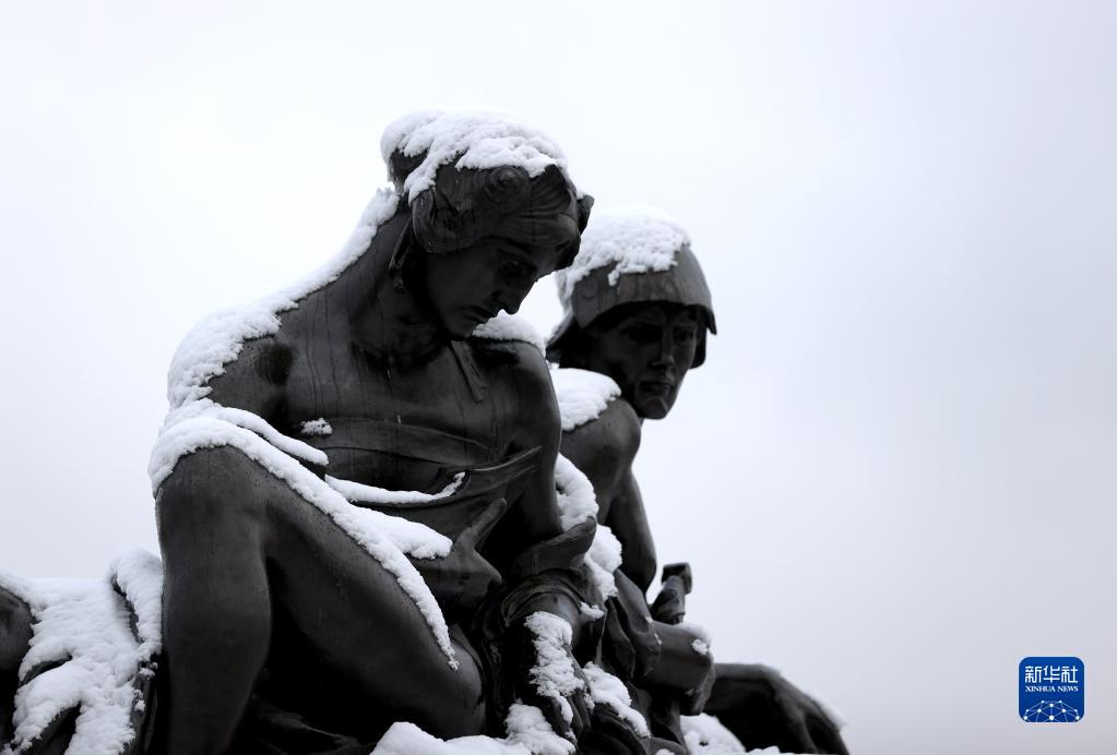 12月12日,英國倫敦白金漢宮前的雕塑被積雪覆蓋。