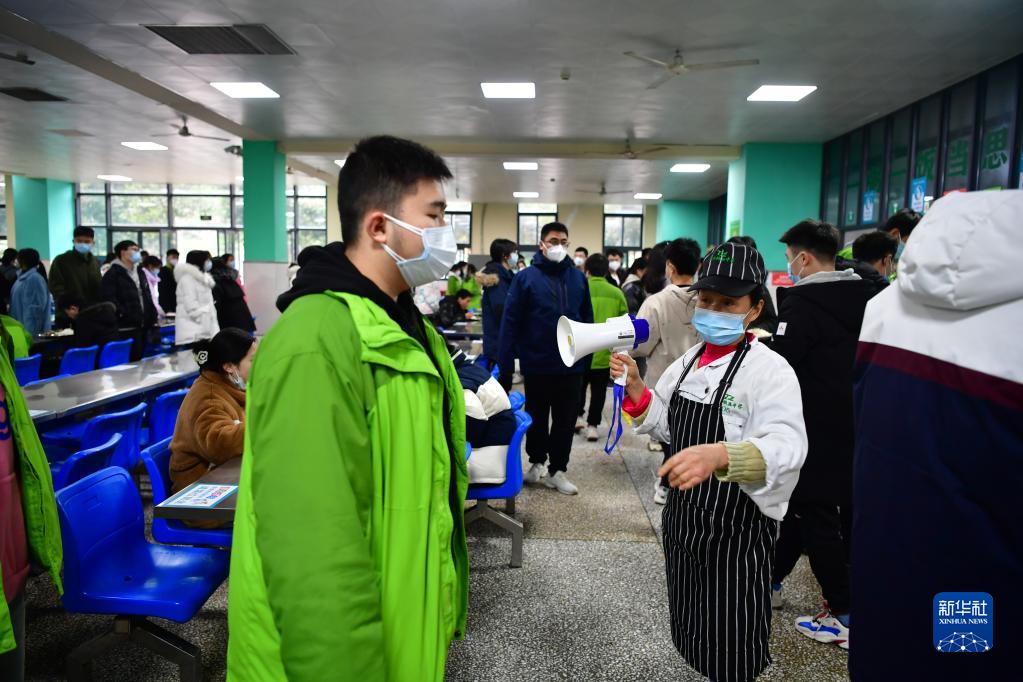 12月12日,在重慶市鐵路中學(xué)校的食堂內,復課學(xué)生在食堂工作人員的引導下有序排隊打飯。