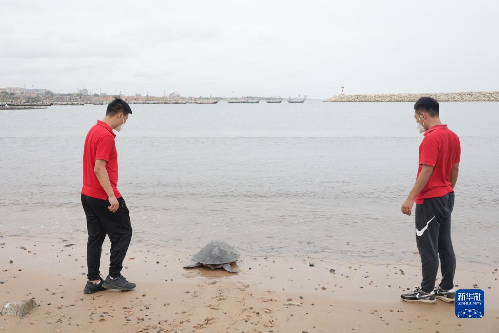 11月4日,工作人員在加納首都阿克拉中國援建加納漁港綜合設施項目施工現場(chǎng)將海龜放歸大海。