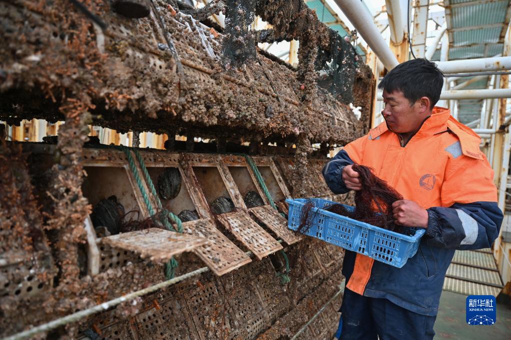 12月13日,漁民在連江縣深遠海鮑魚(yú)機械化養殖平臺“福鮑1號”上用龍須菜喂養鮑魚(yú)。