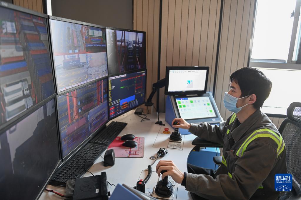在寧波舟山港梅山島國際集裝箱碼頭,橋吊司機在操作橋吊遠程控制系統(12月13日攝)。