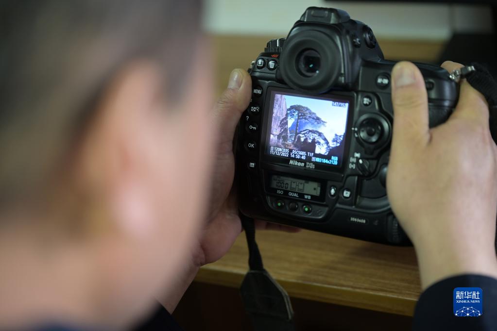 12月11日,胡曉春查看自己剛剛拍攝的迎客松照片。