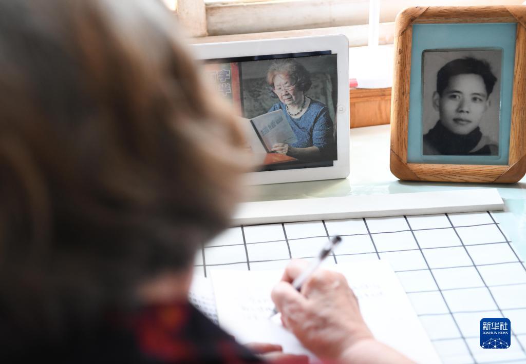 這是5月17日,在安徽省蕪湖市,83歲的張愛(ài)蘭老人在家中寫(xiě)作。書(shū)桌上擺放著(zhù)她和去世37年的愛(ài)人徐國誠的照片。