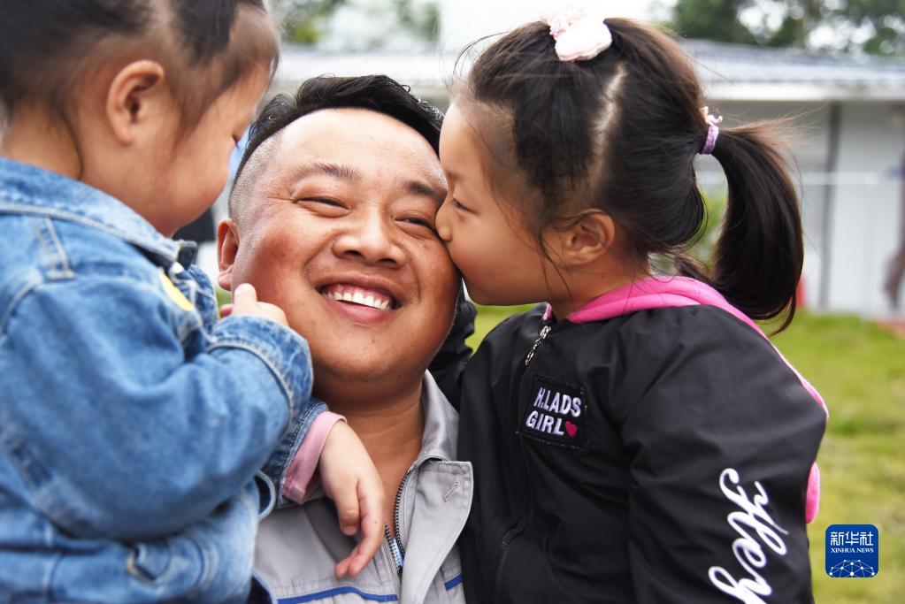 這是1月24日,在廣東省汕尾市海豐縣,沈海高速深圳到汕尾段改擴建項目工作人員楊興義在板房宿舍前與春節前夕來(lái)團聚的孩子們擁抱親吻。