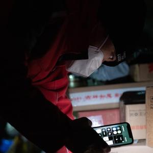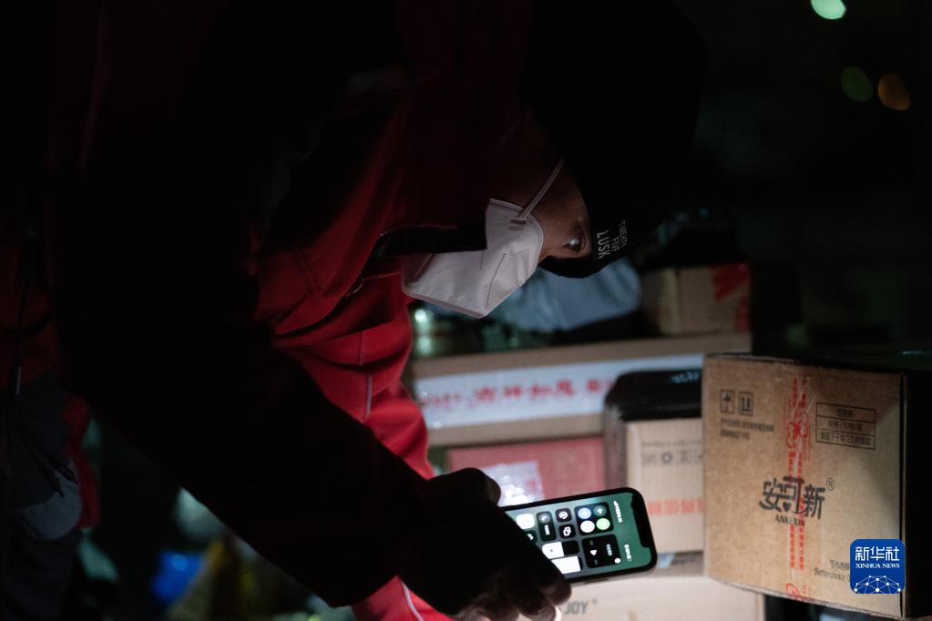 在北京市大興區新源時(shí)代小區,快遞小哥高興興打開(kāi)手機手電筒查看包裹信息(12月15日攝)。