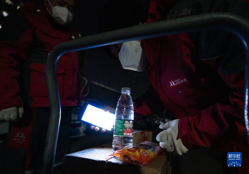在北京市大興區新源時(shí)代小區,一位居民給快遞小哥送來(lái)水和火腿腸,此時(shí)齊帥龍、高興興還沒(méi)有吃晚飯(12月15日攝)。