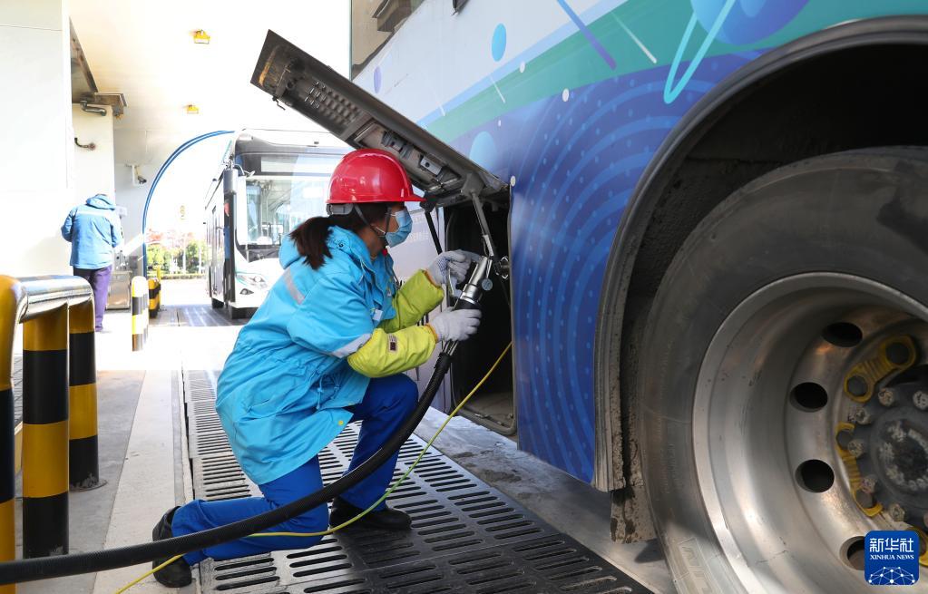 12月15日,一名工作人員在加氣站內連接加氣口,為氫能公交車(chē)加氣。
