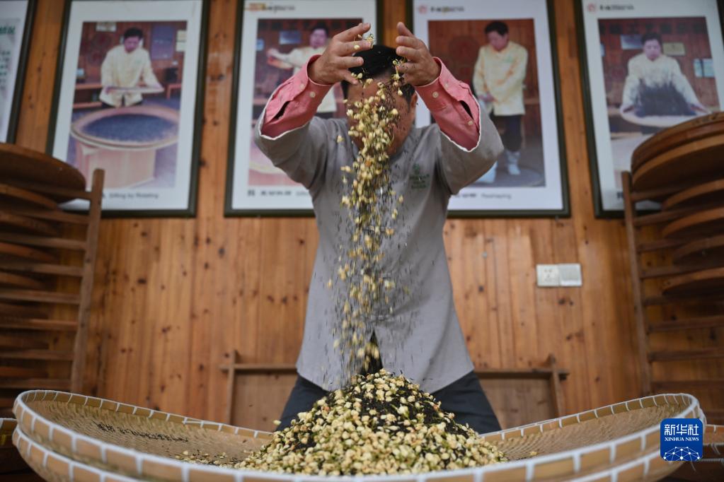12月16日,在福州茉莉花茶制茶工坊,福州茉莉花茶傳統窨制工藝大師傅天甫進(jìn)行制茶的第六道工序“窨”。
