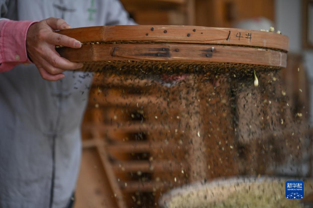 12月16日,在福州茉莉花茶制茶工坊,福州茉莉花茶傳統窨制工藝大師傅天甫在篩茶。篩茶是把需要重復窨次的茉莉花茶中的花和茶葉分離。