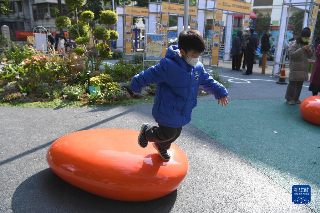 12月17日,小朋友在南寧市青秀區南湖小區改造后的中心花園玩耍。