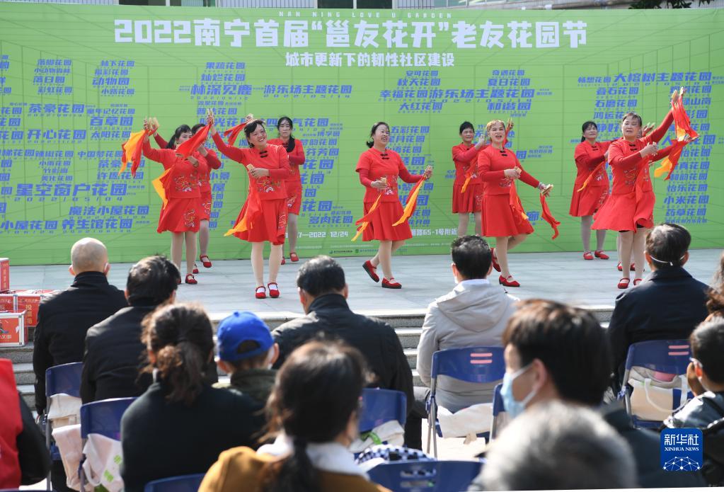 12月17日,2022南寧首屆“邕友花開(kāi)”老友花園節在青秀區南湖小區中心花園開(kāi)幕。這是居民在表演節目。