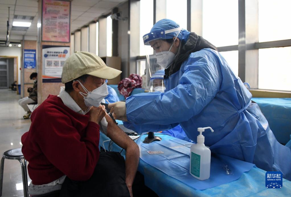 12月15日,在北京市海淀區中關(guān)村街道新冠疫苗接種點(diǎn),醫務(wù)人員為老年人接種新冠疫苗。