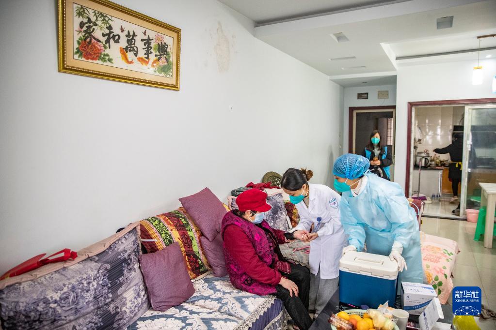 12月16日,在重慶市永川區中山路街道紅河路社區,永川婦幼保健院醫護人員組成的流動(dòng)接種小分隊為上門(mén)接種疫苗的老年人測量血壓。