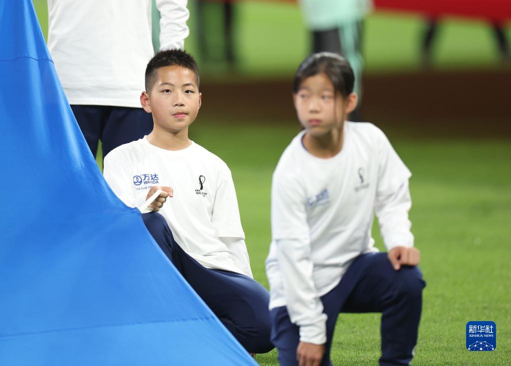 金粲璨(左)在卡塔爾世界杯三、四名決賽開(kāi)賽前作為護旗手出場(chǎng)(12月17日攝)。