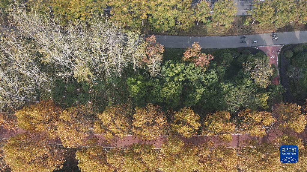 11月24日,市民在安徽合肥巢湖湖濱國家濕地公園騎行(無(wú)人機照片)。