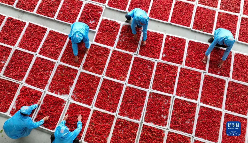 陜西省商洛市洛南縣煜正中藥材專(zhuān)業(yè)合作社的員工在晾曬新采摘的五味子(2022年8月21日攝,無(wú)人機照片)。